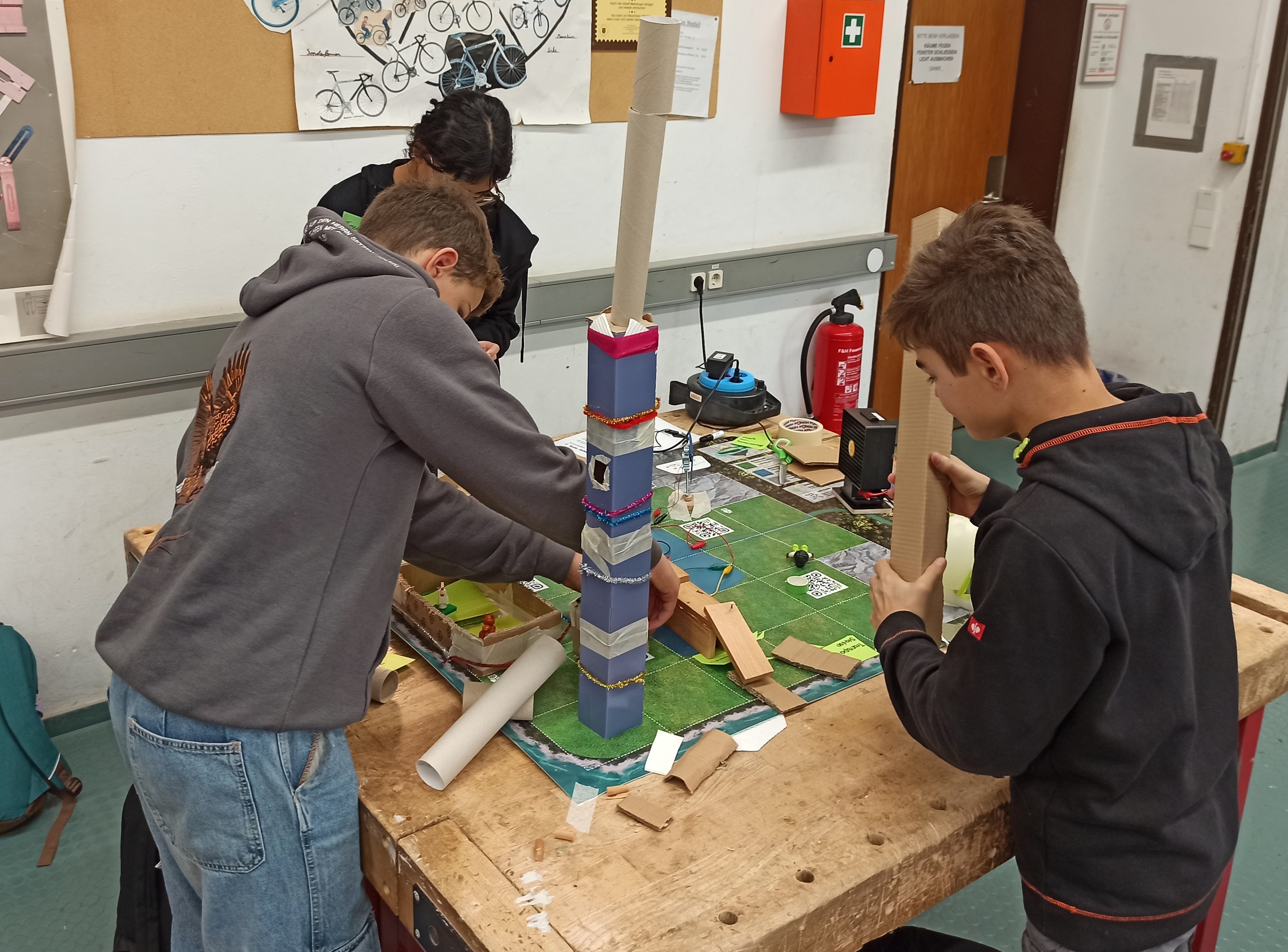Der zweite Teil des Workshops, der von zwei Referenten der Initiative „Jugend forscht“ durchgeführt wurde, hatte nun den Schwerpunkt auf der Praxis. Es galt für die Schülergruppen, ein Modelldorf zu bauen, d.h. wind- und solargestützte Freizeiteinrichtungen und Häuser zu konstruieren sowie Gärten einzurichten.