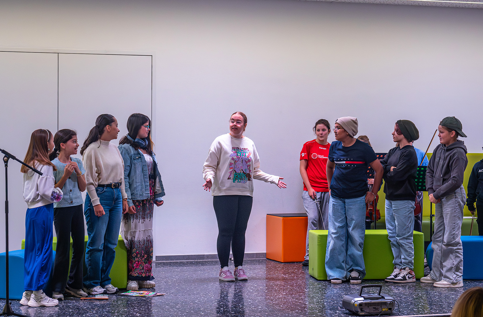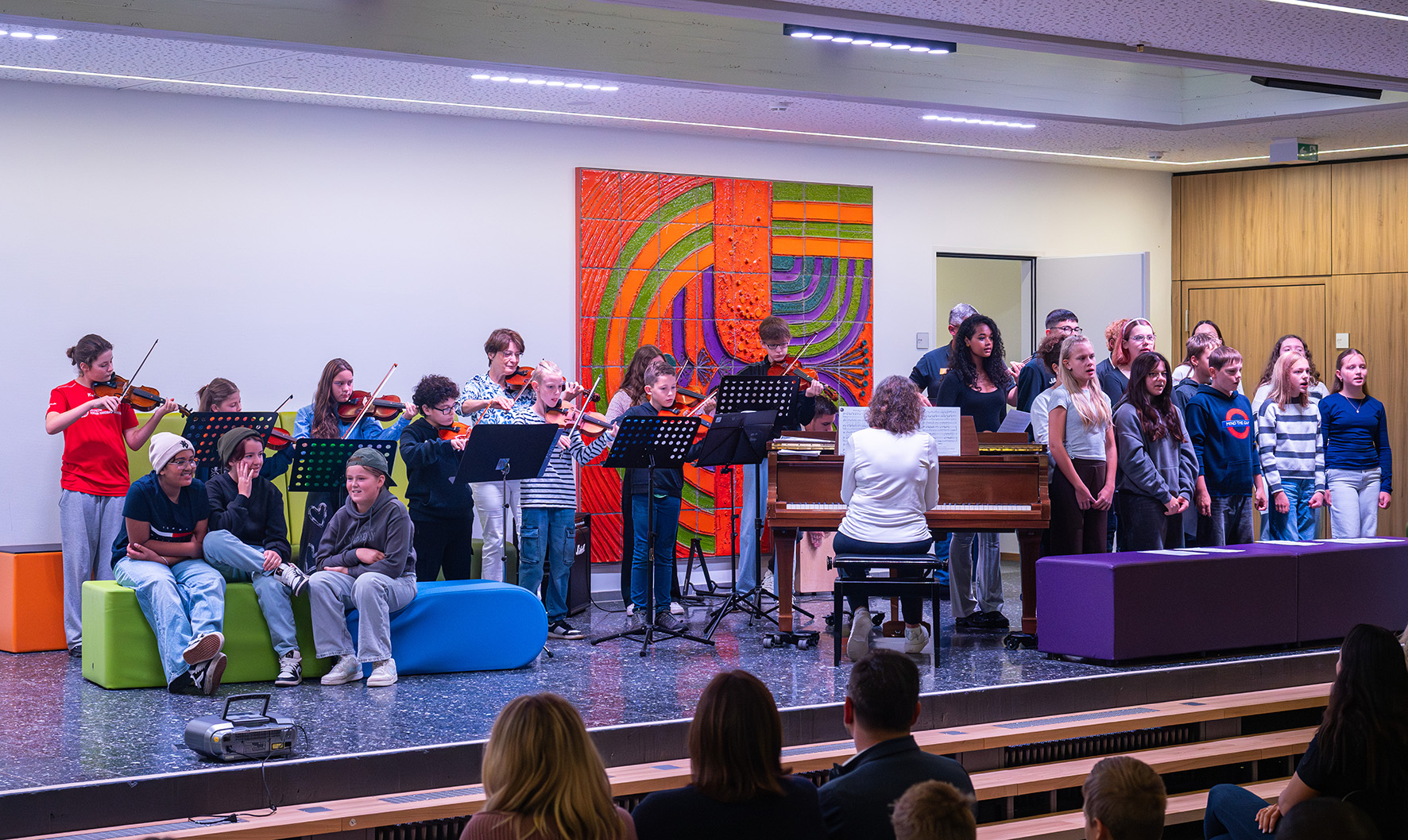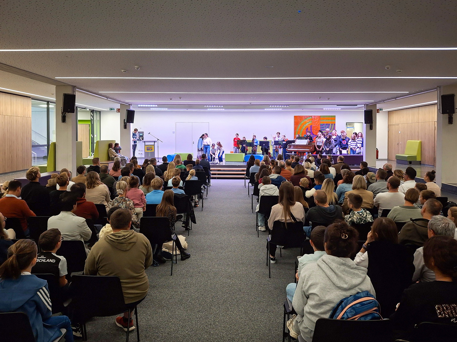 Die Aula brummte am Vormittag des 17. Septembers 2025 vor Aufregung, Freude und Nervosität, denn die neuen 5. Klässlerinnen und -Klässler hatten endlich ihren großen Tag. Begrüßt wurden sie und ihre Eltern und Großeltern, die aufgrund der großen Schülerzahl in zwei Gruppen, einmal um 8.30 Uhr und einmal um 10 Uhr, aufgeteilt waren, mit einem schwungvollen Theater- und Musikstück aus unserem aktuellen Schulmusical „Coco – Superstar“, präsentiert durch Mitglieder der Theater-, Streicher- und Chor-AG unter der Leitung von Petra Kral-Herkommer, Mechthild Ziegler-Knapp und Sebastian Lock.