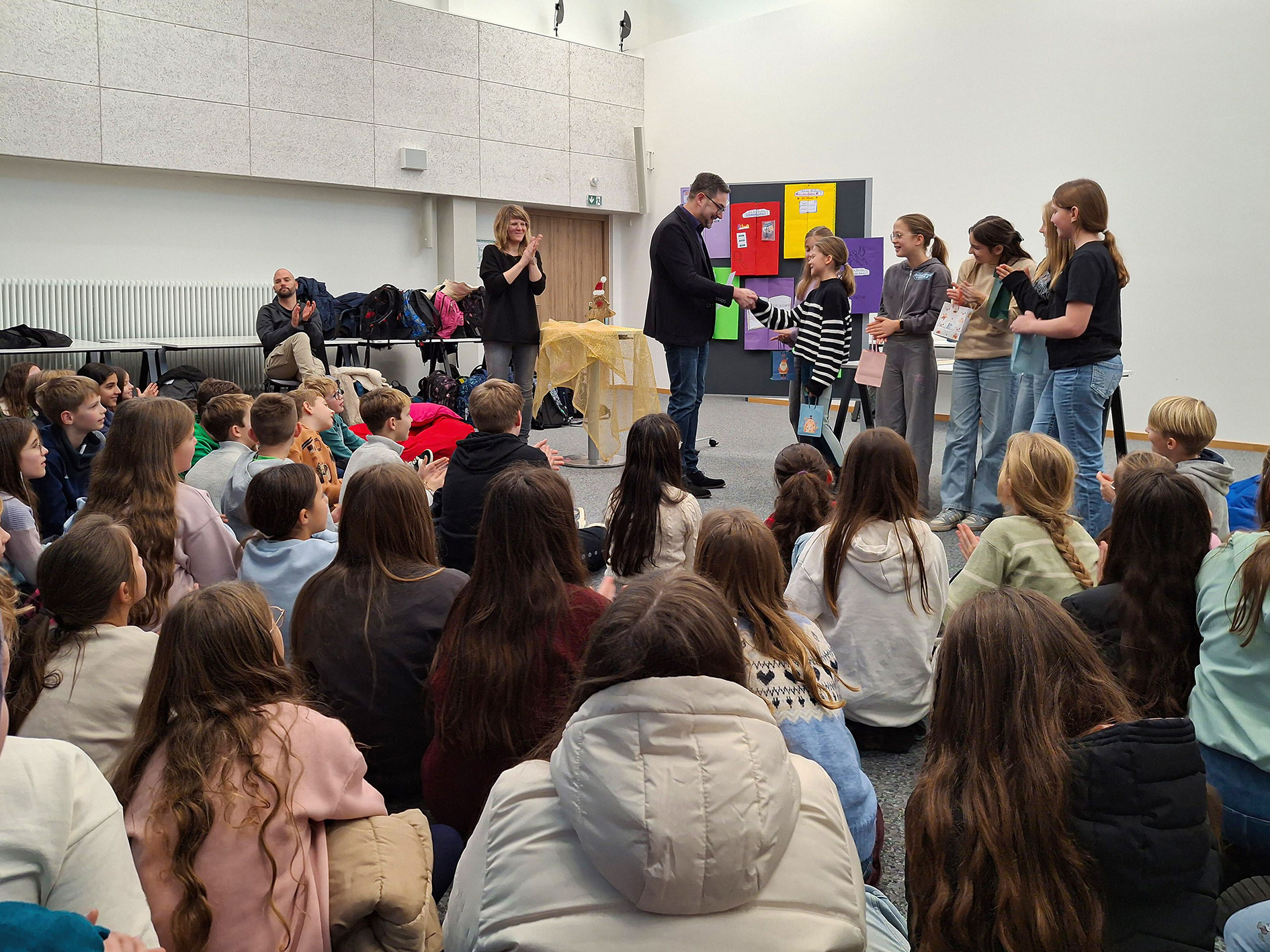 Die Spannung im Mehrzweckraum blieb auch dann noch spürbar, als sich die Jury zur Beratung zurückzog. Erst die Siegerehrung, für die sich Schulleiter Marco Schirk gerne Zeit nahm, löste diese für alle Teilnehmerinnen und Teilnehmer auf.